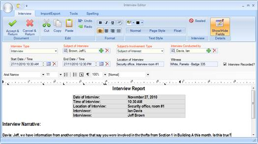 13. When finished composing the transcript, click Accept & Return. The Interview Editor window will close, and the new interview record will be entered in the Interviews grid.