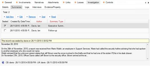 4. In the window, choose the applicable description from the Summary Type lookup list (e.g., Investigation Summary, Follow-up). By default, your name will appear in the Author field.